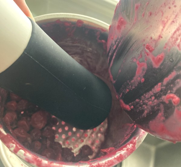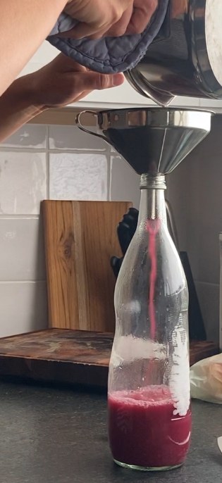 I made mine by separating the seeds using a potato ricer (affiliate links here and below) but in the future I will be investing in a food mill. I also used a filtered funnel to bottle the juice.